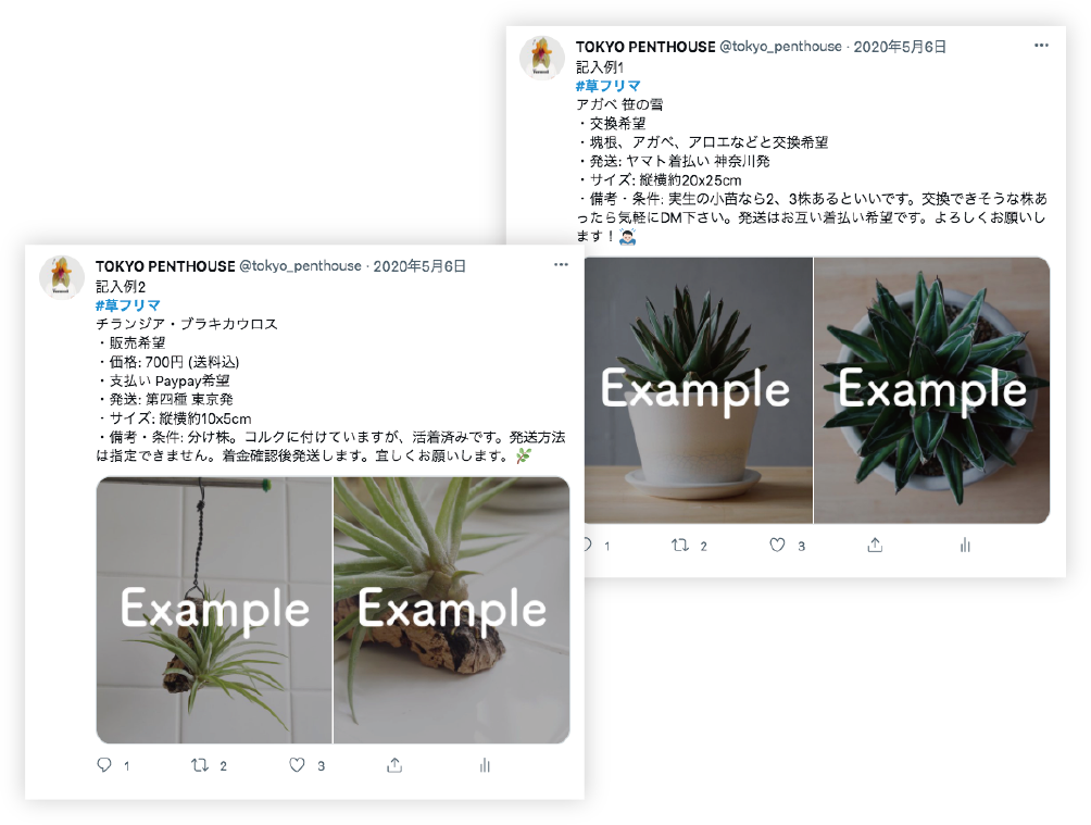 植物の写真、価格、発送方法、その他条件などを書いたツイートにハッシュタグ「#草フリマ」を付けて投稿することで、ツイートを見た欲しい人と直接取引することができます。